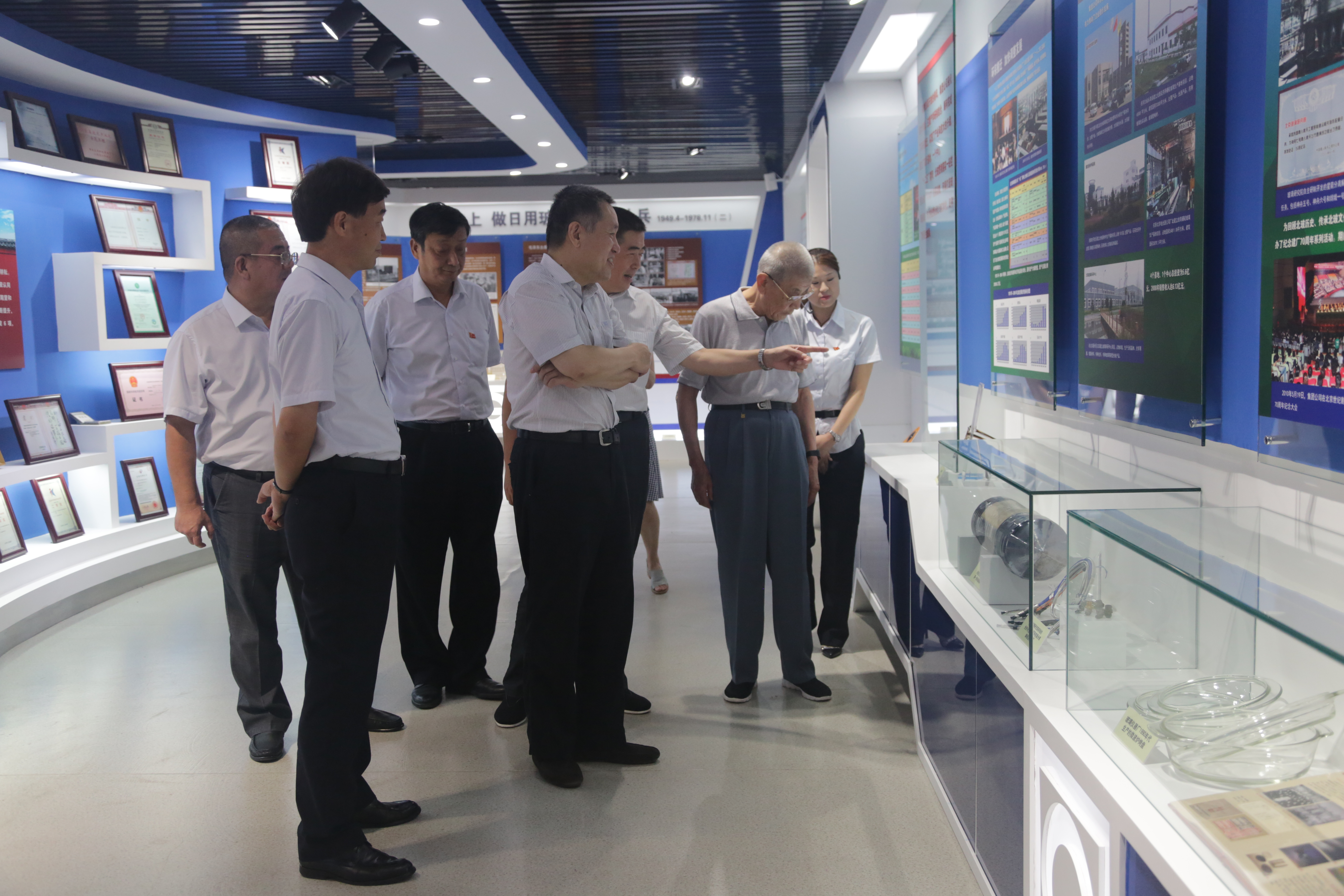 8月4日,國家工商總局局長、集團公司老領導張茅,一輕控股公司黨委書記、董事長蘇志民在集團公司老領導李自新和集團公司領導周法田、劉祥、張希雨的陪同下參觀了北玻展室。